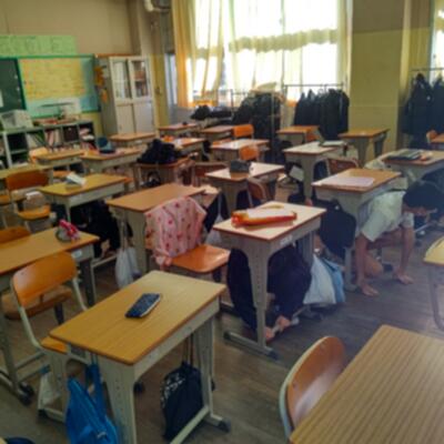 突然、しかも昼休みに緊急放送がながれ、驚いたと思いますが、すぐに状況をとらえ、前回までの訓練を生かして、まずは慌てずにシェイクアウト行動をとる生徒たち。