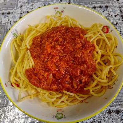 ツナトマトスパゲッティは、トマトとツナの組み合わせが絶妙で、ニンニクがよく効いていて、癖になりそうな味わい。