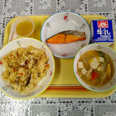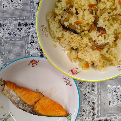 五目ご飯は、人参、ごぼう、椎茸、油揚げ、コンニャク…それぞれの具材によく味が染みていて、鮭の塩焼きによく合います。