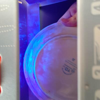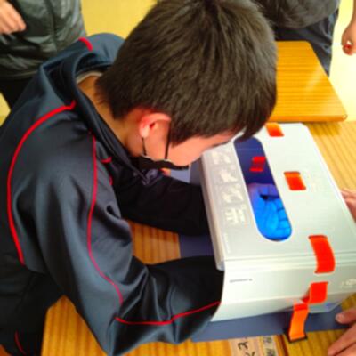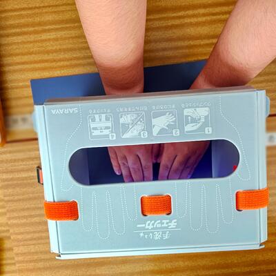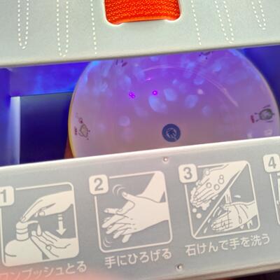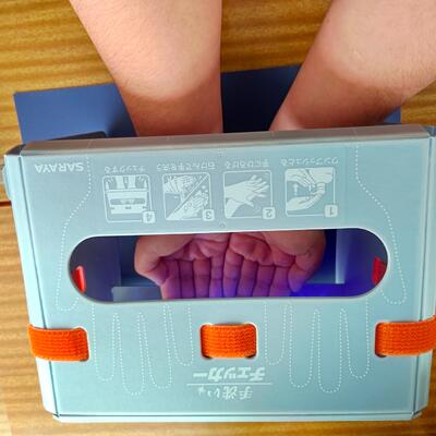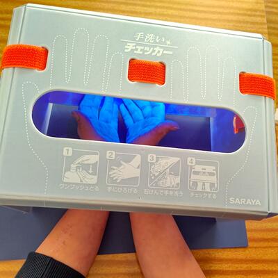 そのままでは見えない手の汚れが、青く光って浮かび上がる「手洗いチェッカー」。