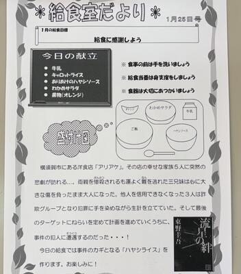 久々の「お話し給食」は、東野圭吾のミステリー小説「流星の絆」から。