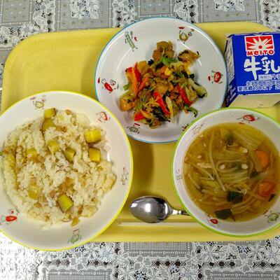 さつまいもとハムのピラフ & チキンのコロコロ炒め