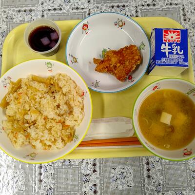 そろったクラスから「いただきます」…唐揚げがメインのお重をおかずに、おかわり自由の白ご飯が進みます。