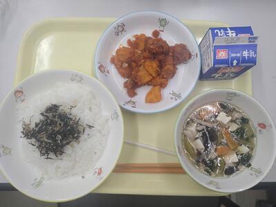 ピリ辛チリソースが、ホクホクのじゃがいもと柔らか鶏肉によく絡んで…ひじきの振りかけがかかった白ご飯によく合います。