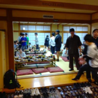 部屋でのんびり…は後回しにして、夕飯会場に集まります。