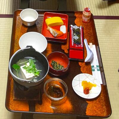 今日の朝食は部屋食…美味しそうな朝の献立がのった御膳が各部屋に運びこまれました。
