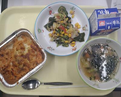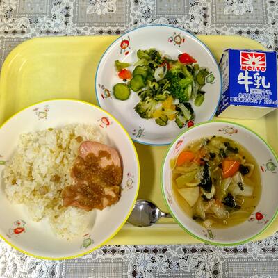 そろったクラスから「いただきます」…唐揚げがメインのお重をおかずに、おかわり自由の白ご飯が進みます。