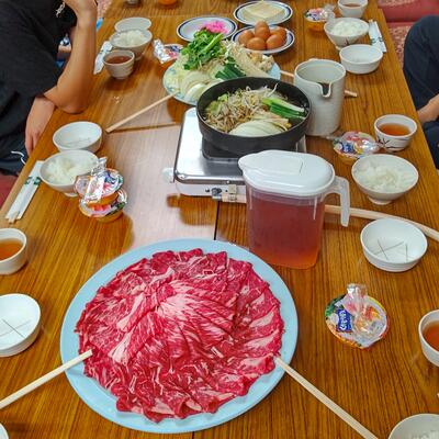 会場に入るや、大皿いっぱいの赤々とした牛肉の迫力に目を奪われます。野菜や豆腐などの具材もかごに山盛りで、食べる前からみんなテンションMAX!