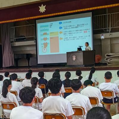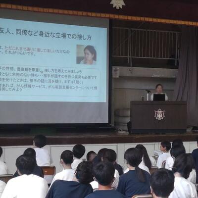 市内総合病院の「がん専門看護師」の方を講師としてお招きし、2学年生徒・保護者・職員を対象に講演していただきました。(昨年度も来ていただいた方です)