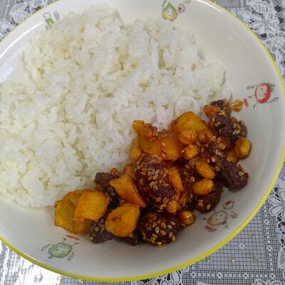 カリカリの大豆、ホクホクのポテトとよく合います。ケチャップであえて、白ゴマを振った味付けも絶妙です。