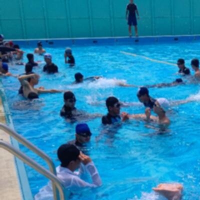 写真は2年生の授業。今日はそれ程暑くなかったので、水に入るとちょっと冷たかったようですが、みんな気持ち良さそうに初プールを楽しんでいました。