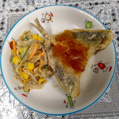 衣はサクサクで身はフワフワ。あじの旨みと南蛮漬けのタマネギの味が調和して絶品です。