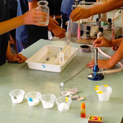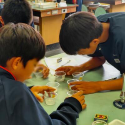生徒たちは、小学校で習った知識も使って自分たちで実験を計画し、グループで実験を実行。