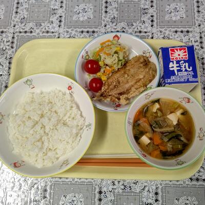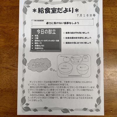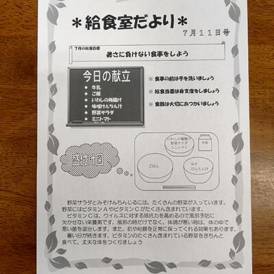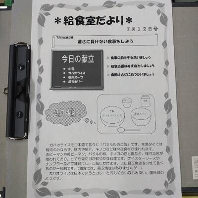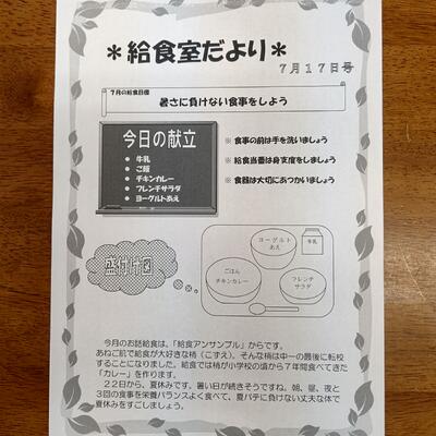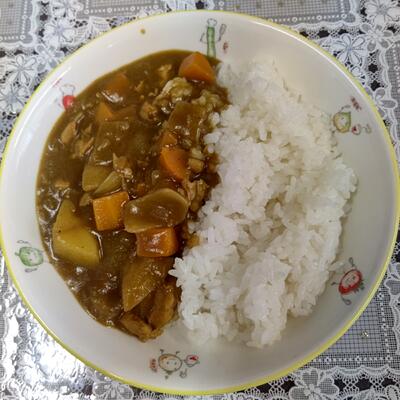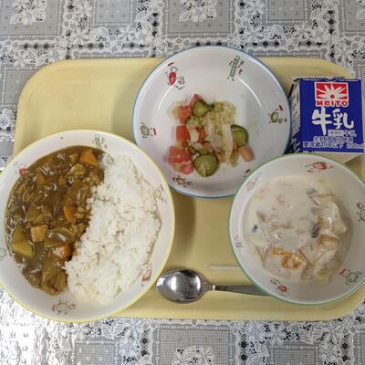 1学期最後の給食は、みんな大好きカレーライスです。じゃがいも、ニンジン、タマネギ、そしてお肉…それぞれの具材のバランスがよく、味もスパイシーながら辛過ぎず、丁度いい辛さです。