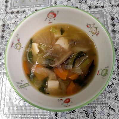 味噌けんちん汁は、たくさんの野菜が入って栄養たっぷり。味噌の味付けがよくあいます。