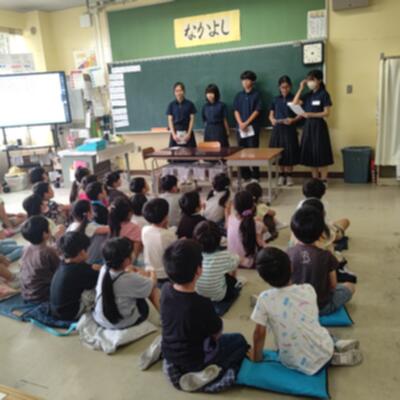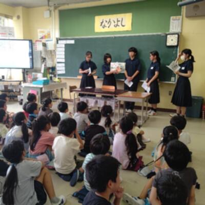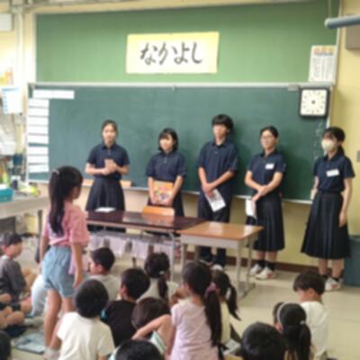 グループごとに選んだ絵本を持って、小学校1年生の各教室を訪れます。 控室ではちょっと緊張していた中学生ですが、期待いっぱいの表情で大歓迎してくれる1年生のおかげで、気持ちがほぐれ、自然に笑顔がわいてきます。