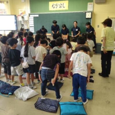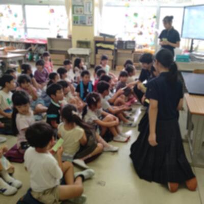 読み終わった後は、絵本のなかからクイズを出したり、感想を聞いたり…ふれあいの時間。 たくさん用意してきた手作りのお土産を配ると、子供たちはまた大喜び。あっという間にお別れの時間です。