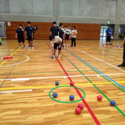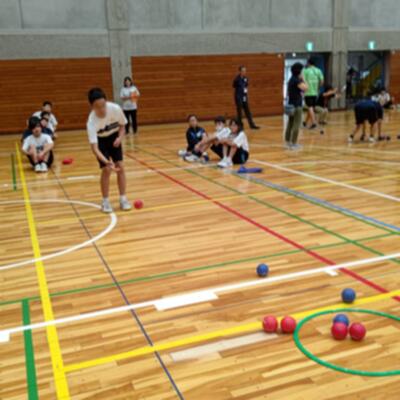 次は「サークルターゲットスロー」 ボッチャのボールを、数メートル先に置いた輪をめがけて順番に投げます。学校でたくさん練習してきた競技です。