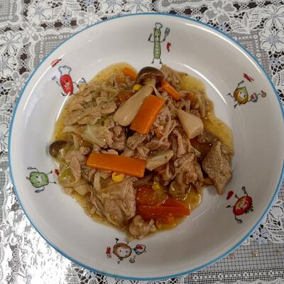 数種類のきのことしゃきしゃき野菜の食感がよく、コクのある味噌の味付けにご飯が進みます。豚肉がたっぷり入って満足感も十分です。