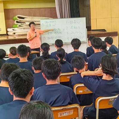 途中、クイズやペアワークなど生徒の活動の場面も加えながら、温暖化の話、コミュニケーションのコツ、失敗を成功に変えるスーパーポジティブ思考の身に付け方など、有意義な話が盛りだくさん。