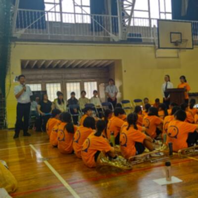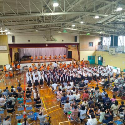 ニ中体育館を会場に、ブロックの小学校・中学校の合唱部・吹奏楽部が集まってお互いの演奏を披露し合う音楽会です。開演前から子供たちは早く集合して準備に余念がなく、保護者の皆さん、先生方もたくさん集まって…みんなとても嬉しそうで開会を待ちます。