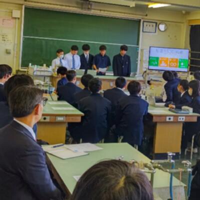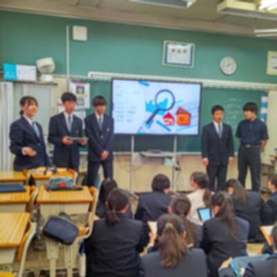 各クラスの教室と特別教室を利用した8会場で、各会場6~8ほどのグループが発表し、会場ごとにお互いの発表を聴き合います。校外学習でグループごとに企業を訪問し、SDGsの取組について学んできたことを事後学習としてまとめた成果の発表です。