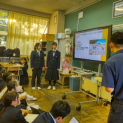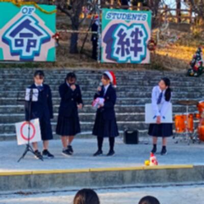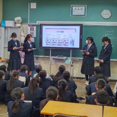副会長から「SIC(ストップいじめキャンペーン)の活動として、生徒会が再現動画を作成して授業を行った」「『日本生徒会大賞』に参加して全国3位に選ばれ、他校の活動を聞くことができた」「地域主催のNフェスの開催に関わり、ステージの進行などを行った」など、これまでの活動の紹介がありました。