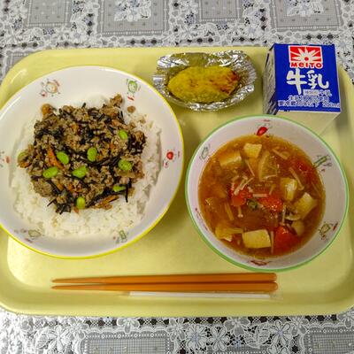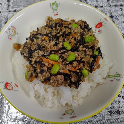 肉味噌ひじき丼は、程よい濃さの味噌味とひじきの風味がいいバランスで、枝豆が彩りと食感を加えてくれています。