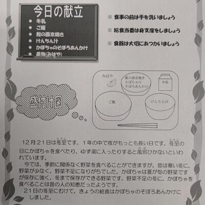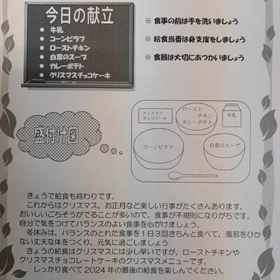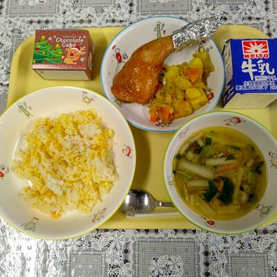 今日は今学期最後の給食…ということで、一足早いクリスマス仕様の献立です。