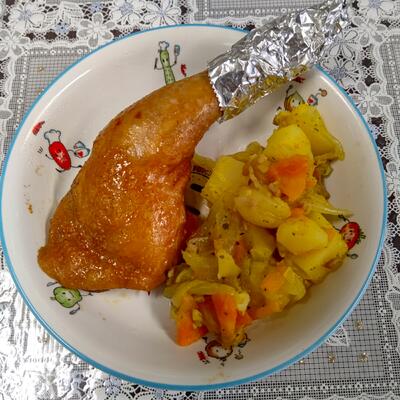 ローストチキンは給食室で煮て、照りを付けて焼いた手作り。
