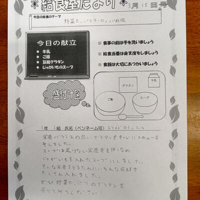 2024年3月の記事一覧 2024年3月 全ての記事 アーカイブ 2025年12月 (4) 2025年11月 (18) 2025年10月 (20) 2025年9月 (20) 2025年8月 (2) 2025年7月 (14) 2025年6月 (21) 2025年5月 (20) 2025年4月 (16) 2025年3月 (24) 2025年2月 (36) 2025年1月 (30) 2024年12月 (18) 2024年11月 (31) 2024年10月 (32) 2024年9月 (24) 2024年8月 (3) 2024年7月 (28) 2024年6月 (51) 2024年5月 (30) 2024年4月 (28) 2024年3月 (16) 2024年2月 (26) 2024年1月 (22) 2023年12月 (21) 2023年11月 (29) 2023年10月 (40) 2023年9月 (39) 2023年8月 (3) 2023年7月 (37) 2023年6月 (68) 2023年5月 (23) 1件 1件 5件 10件 20件 50件 100件 今日の給食 投稿日時 : 2024/03/15 第二中学校管理者 豆腐グラタン 今日も1年生が家庭科の授業で考えた献立です。 テーマは「野菜たっぷりヨーロッパ料理」 栄養バランスの良い豆腐グラタンを中心に考えたメニューとのこと。 スープは足りない栄養素を補うために、じゃがいもをはじめ、いろんな食材をたくさん入れた工夫を凝らしたスープです。 ↓「いいね!」を押して、二中生と二中の取組を応援してください !(^^)! {{options.likeCount}} {{options.likeCount}} « 123456789 »