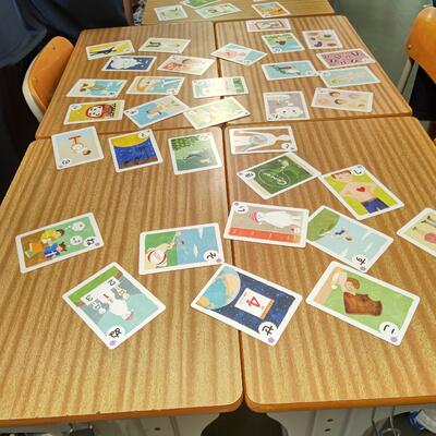 カルタ終了後は、感想や一番印象に残った札のフレーズをワークシートに書き込み、自分ならどんな札を作るか考えて、実際に読み札と取り札を書いてみました。