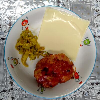 食べ応えのあるハンバーグ、スパイシーなキャベツのカレー炒め、そして定番のスライスチーズ…
