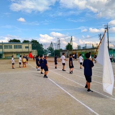 毎日コツコツ練習している、有志による「応援団」が、グラウンドで動きの確認をしています。