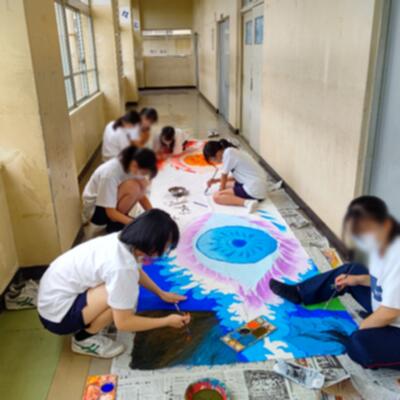 美術部は、毎年恒例のスローガン(今年は「何でそんなに強いんですか?~二中をフォローしているから」)が入った、大横断幕の制作中。今年もかっこいいのが出来上がりそう!…楽しみです。