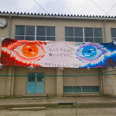 生徒が考えた今年のスローガンは「何でそんなに強いんですか?~二中をフォローしているから~」