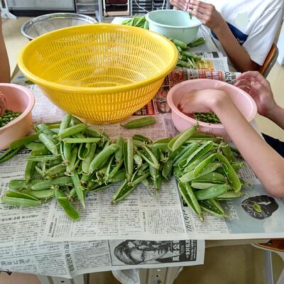 その後みんなでさや剥き体験。大量のグリーンピースは、今日の全校の給食に使われます!