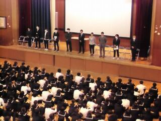 教頭先生からは、1日に発生した地震への対応について、「正しい判断をするためには日頃から準備しておくことが大切。今年は暗い話が多いが、いい年にしましょう。」と箱根駅伝で活躍したチームを例に新年のお話がありました。生徒指導の先生からは、「SNSの使い方に注意しましょう。3学期はとても短いので、日々の生活を大切にしましょう」というお話がありました。