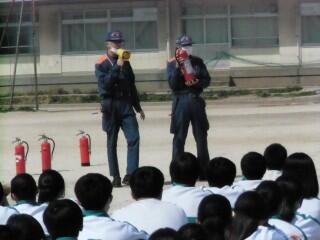 1年生は中学校で初めて、2・3年生は新しい学年、クラスになって初めてということで、避難経路の確認を行いました。消防署から、学校だけでなく、様々な場所で災害に遭った時を想定することの大切さについて話がありました。また、被災した場合の「自助・公助・共助」の大切さについても話がありました。