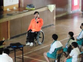 大学生のときにバイク事故で脊髄を損傷し車いすでの生活となり、その後、パワーリフティングのパラアスリートとして活躍する中で、自信を持ち輝き続けている宇城元さんの姿を見て、みんな元気づけられ、感動しました。講演の中で、何度も、「どんな状況でも希望を持って、くじけず、諦めず、続ければ、何でもできる。その中で、一緒に目標をともにできる仲間をつくろう」と生徒たちに訴えかけました。