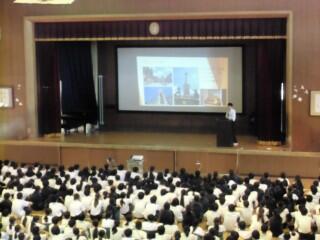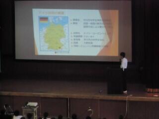 今年度の海外派遣生徒(3年生)より、ドイツローゼンハイム市での生活や思い出に残ったことなど、写真を通して発表しました。日本と違ったドイツの生活について、詳しく発表してくれました。印象に残ったことなど、熱心に説明する姿がとても印象的でした。