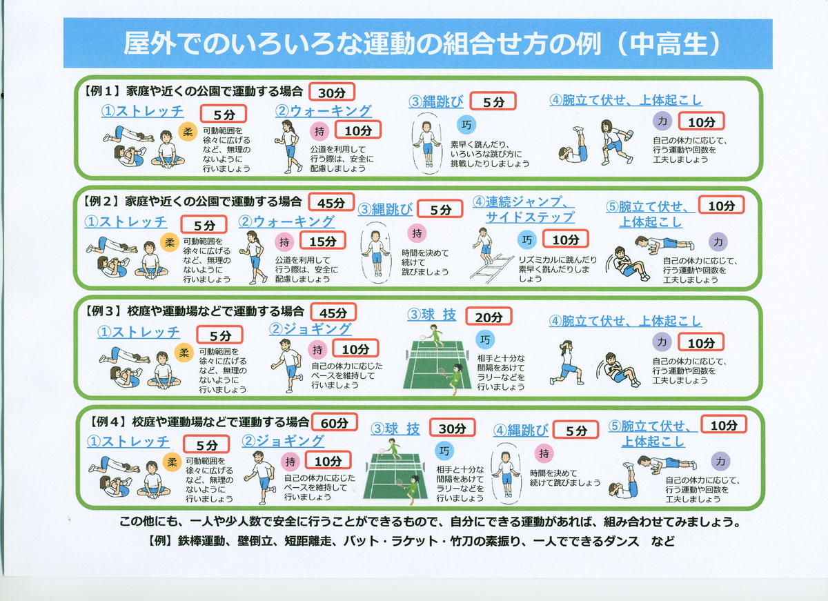 ・毎日、30~60分程度を目安に、いろいろな運動を組み合わせて取り組みましょう。