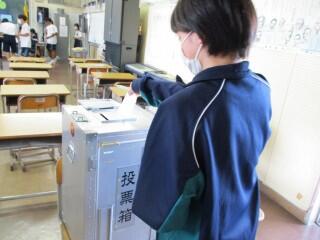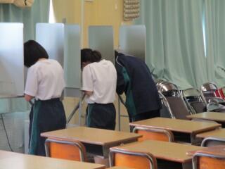 演説後の投票は3つの投票所を設置し、各学年ごとに行われました。投票所で記載台に向かって、一人一人が投票用紙に書き込む姿や投票箱に投票用紙を入れる場面が初々しく印象的でした。放課後、選挙管理委員によって開票が行われ、明日結果が発表されます。