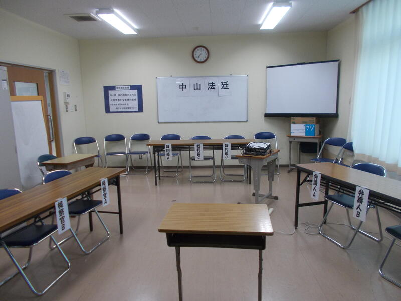 多目的室を裁判所に見立てて、裁判官、検察官、弁護士、