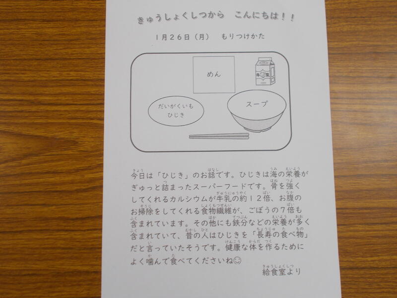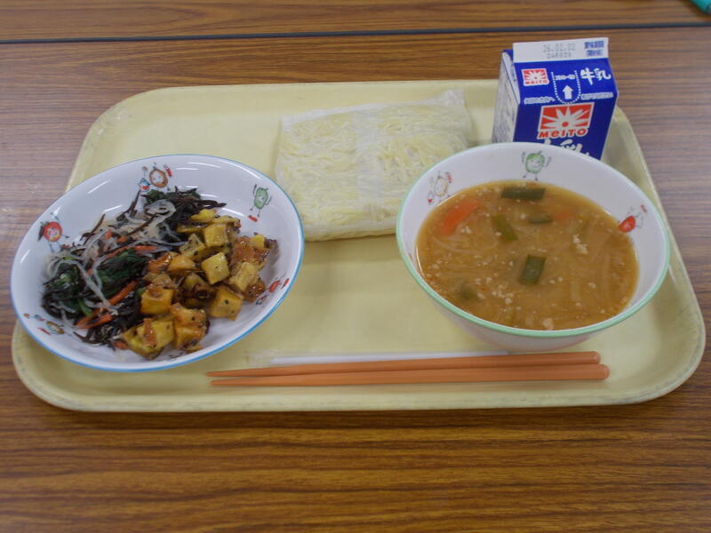 今日の給食は、味噌ラーメン、ひじきの中華和え、大学芋、牛乳でした。