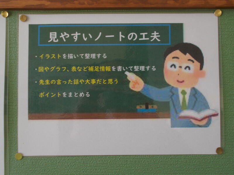 1年生の社会では、見やすいノートを掲示しています。どんな工夫が必要かな?