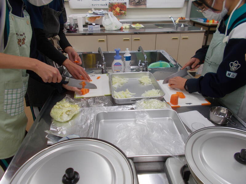 2年生の家庭科では、調理実習を行っています。今回は、「サケのちゃんちゃん焼き」です。