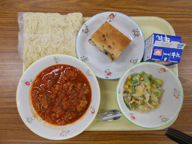 今日の給食は、韓国料理のビビンバ、ナムル、ケランマリ、チジュハットグ、牛乳でした。