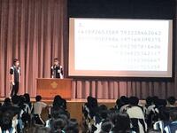 生徒会主催の全校集会が開かれました。今回は、体育委員長・修学旅行実行委員長の話、2学年のP1グランプリ優勝者、四中ギネス(演劇・円周率)等々盛沢山でした。