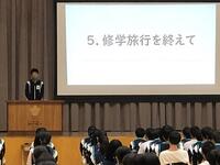 1学年が体育館で横浜校外学習の振り返りを行っていました。各グループがパワーポイントでまとめたものをクラスで発表し、クラスで選ばれたグループが全学年の前で発表しました。